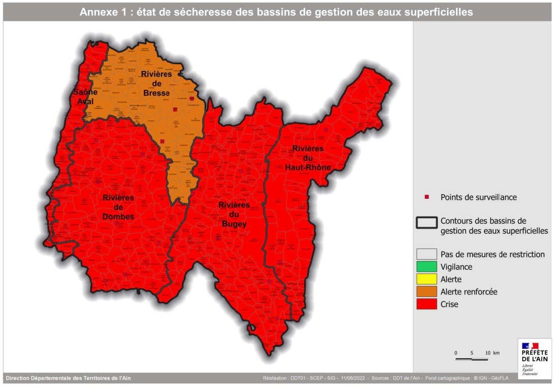 La persistance de la sécheresse et de températures élevées amplifie la dégradation de l’état de la ressource en eau du département. Désormais tout le département, excepté pour le secteur Rivières de Bresse, est placé en situation de crise sécheresse pour les bassins de gestion des eaux superficielles.