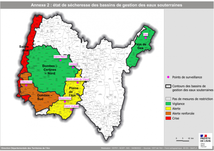 Un dernier arrêté publié par la préfecture vient de tomber, à la suite du dernier comité restreint de l'eau qui s'est tenu ce jour Désormais, tous les bassins de gestion des eaux superficielles sont classés en situation de crise pour la sécheresse, excepté pour le secteur Rivières de Bresse qui lui est placé en alerte renforcée. Pas de changement en revanche du côté des bassins de gestion des eaux souterraines.
